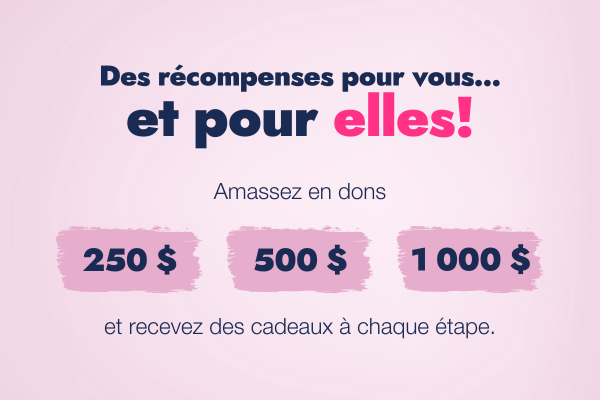 Cette année, pour vous motiver à participer et à vous dépasser pour la cause, des cadeaux vous seront remis lorsque vous atteindrez les seuils de 250 $, 500 $ et 1 000 $ en dons amassés.